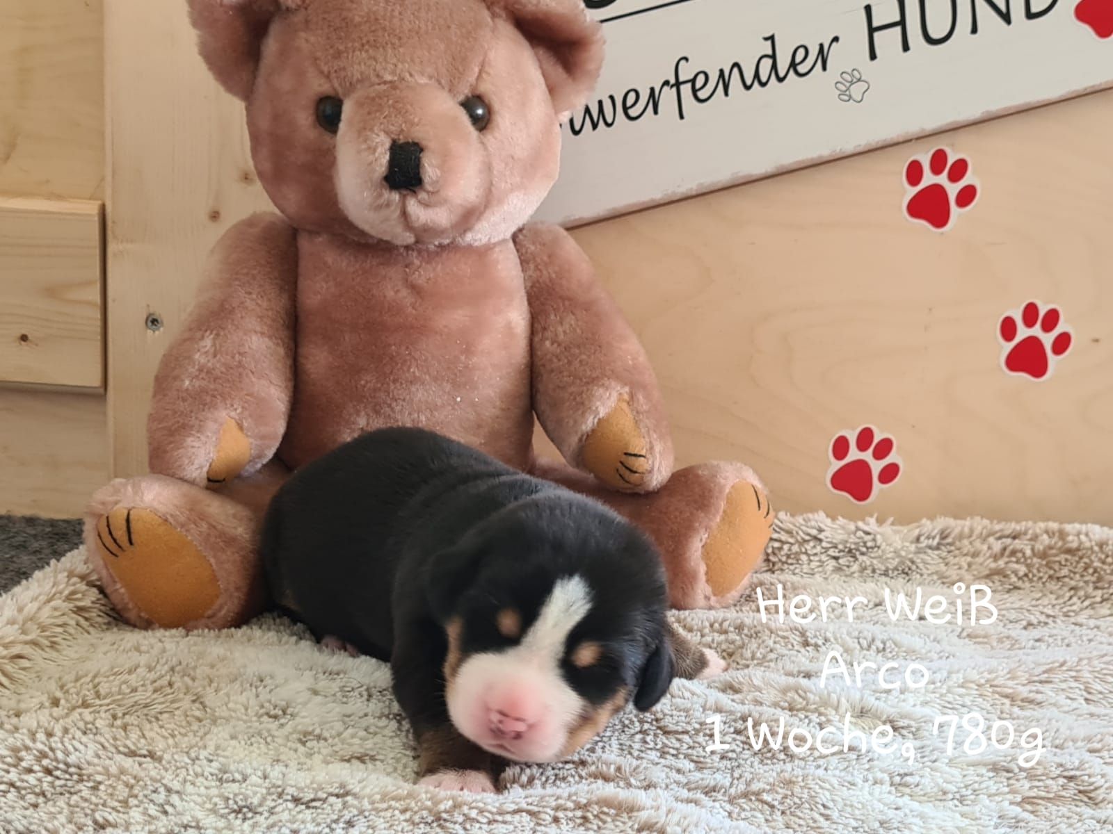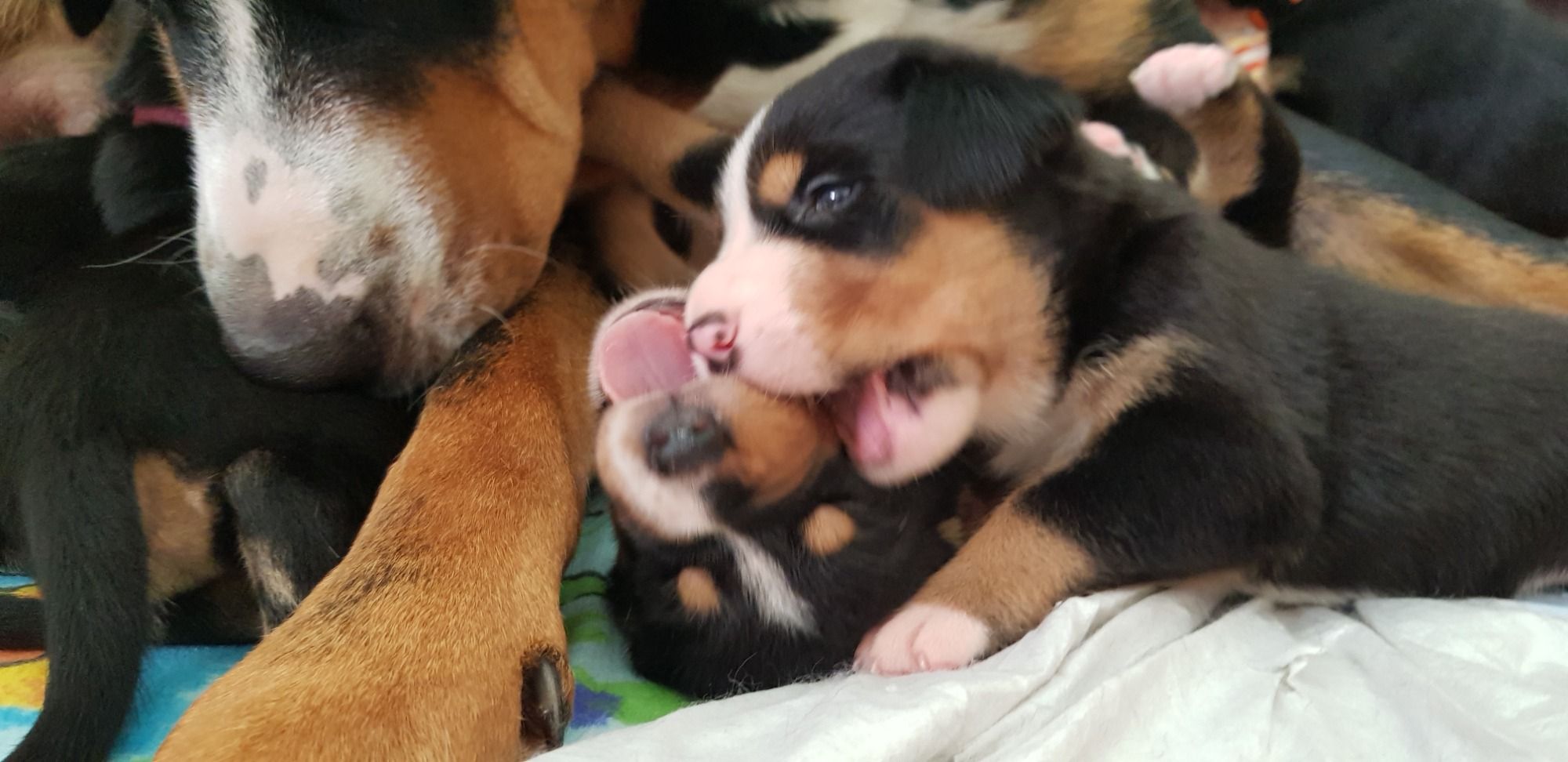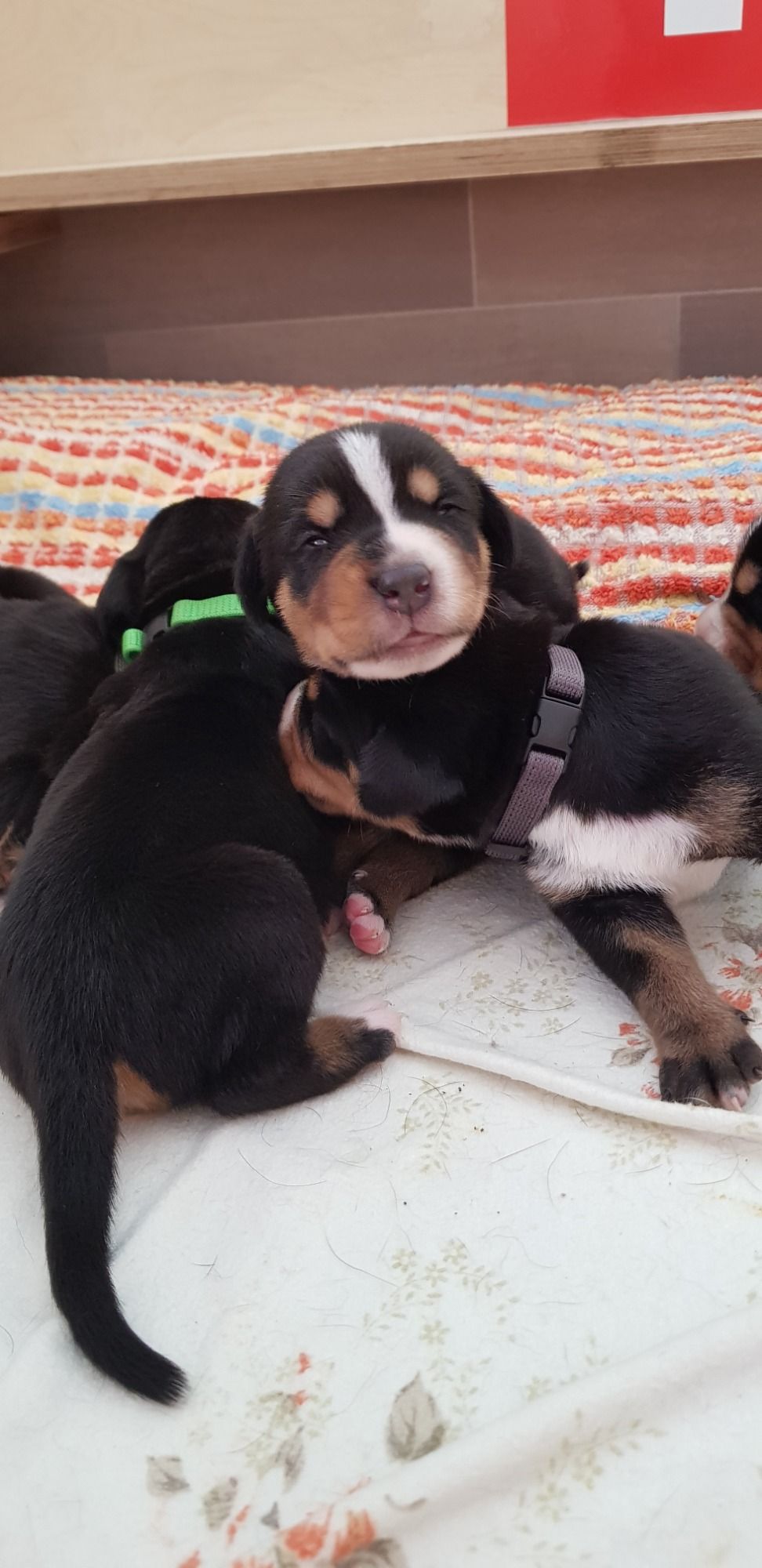 Langsam geht es rund in der Wurfbox. Die kleinen Großen Schweizer werden aktiv. Die Äuglein sind aufgegangen und die ersten Steh- und Gehversuche werden unternommen.
