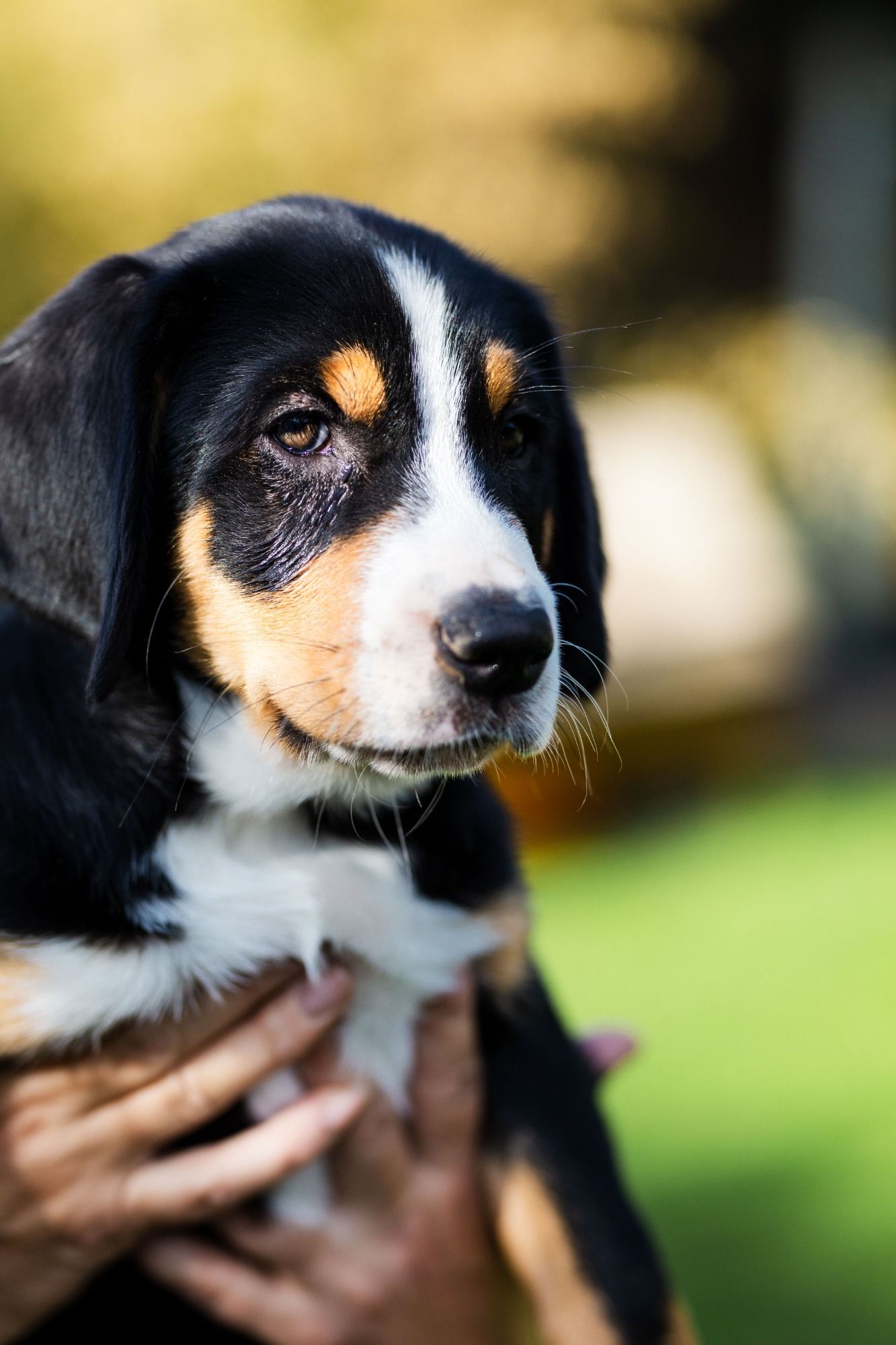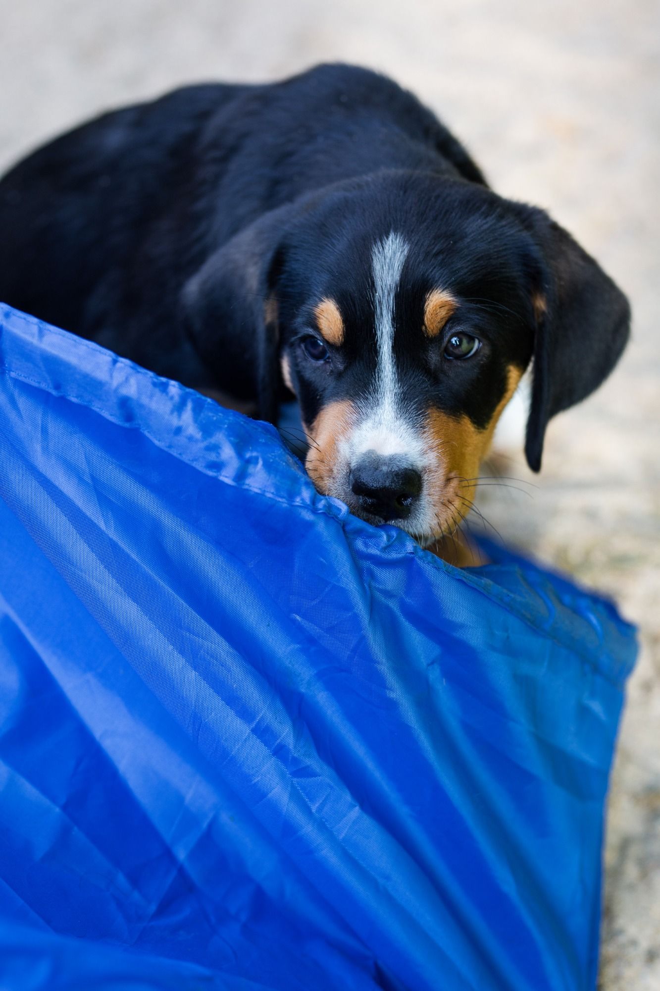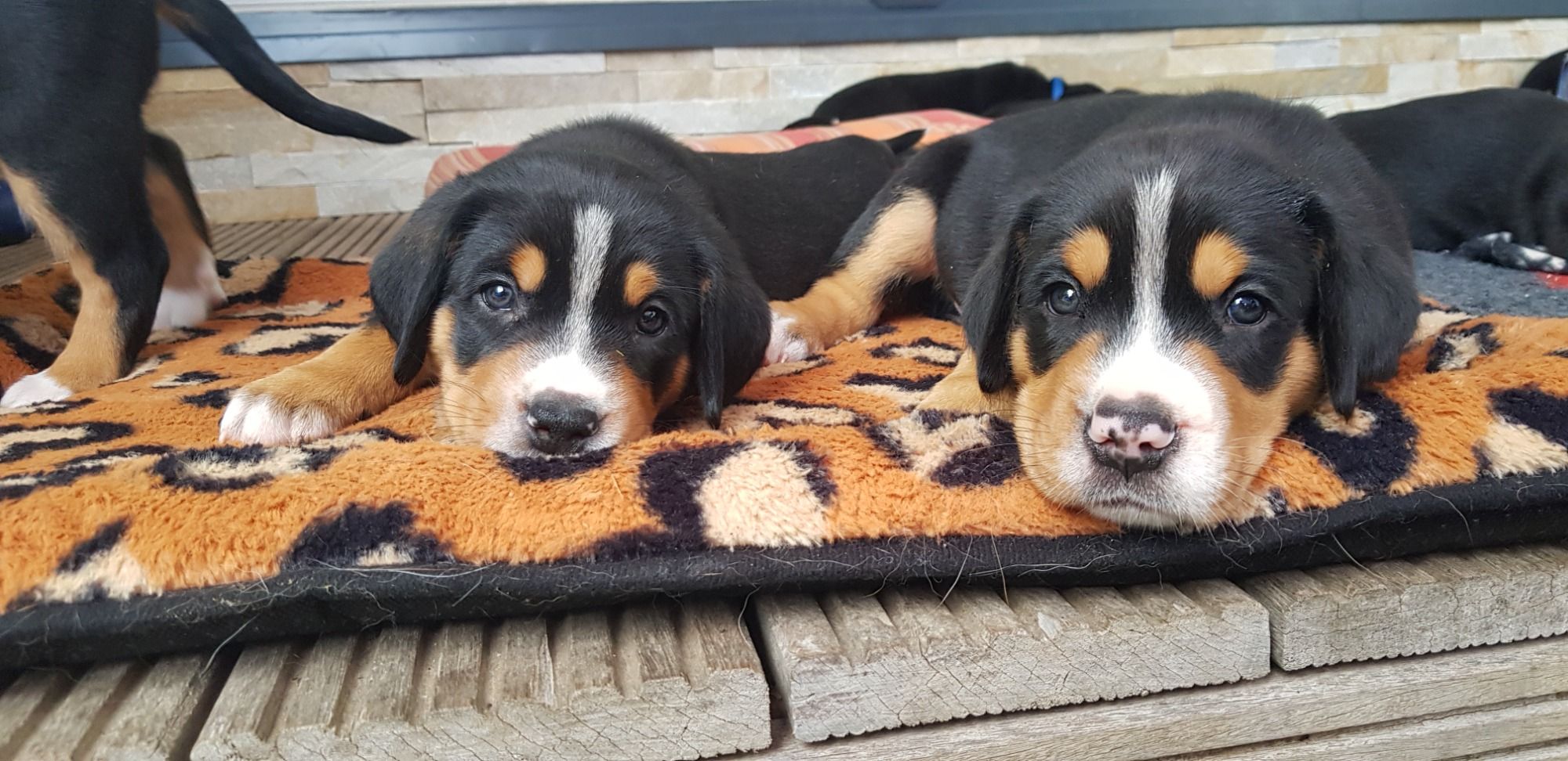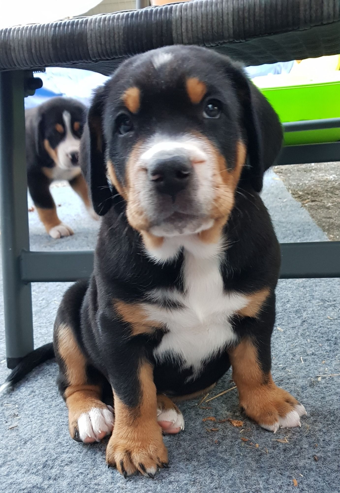 Langsam geht es rund in der Wurfbox. Die kleinen Großen Schweizer werden aktiv. Die Äuglein sind aufgegangen und die ersten Steh- und Gehversuche werden unternommen.